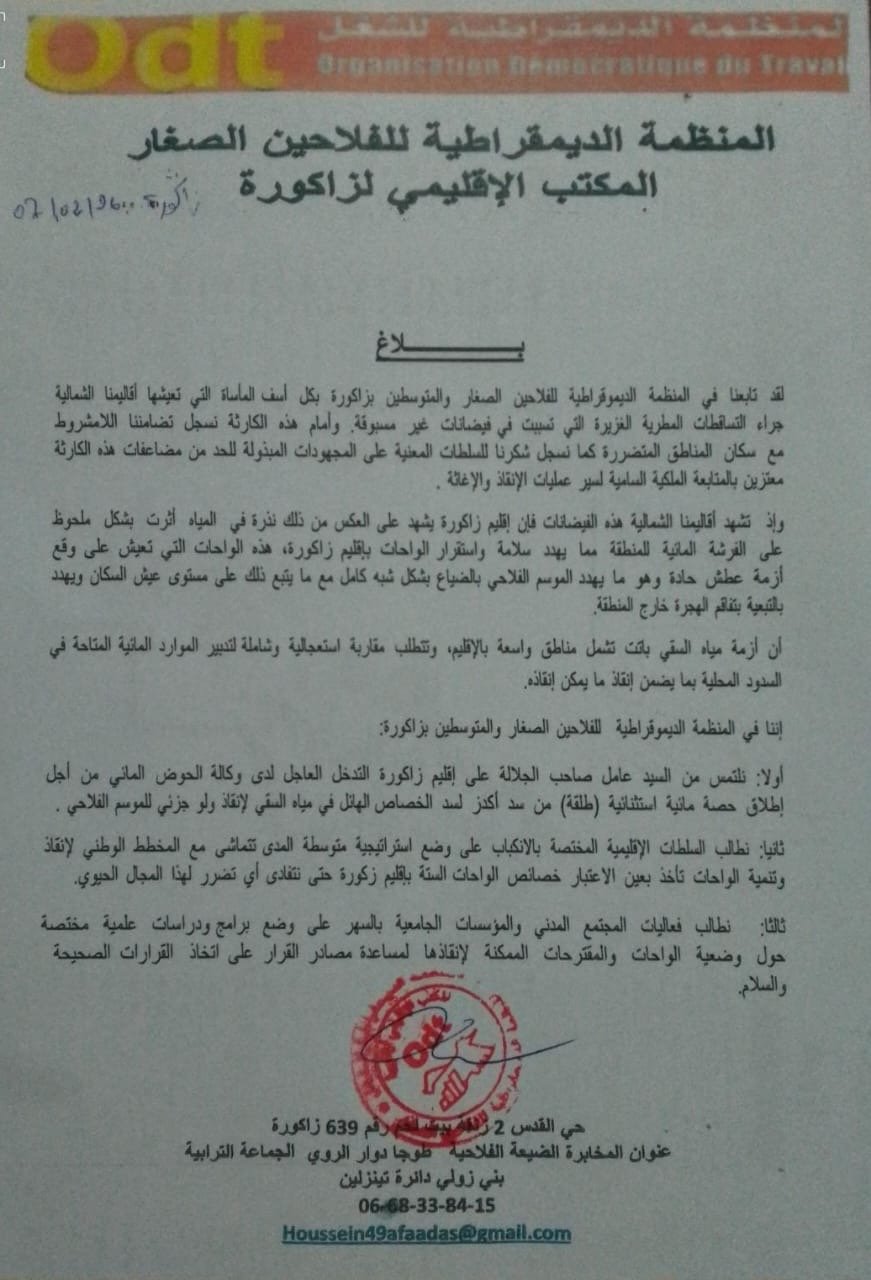 1. نداء للعامل: التماس عاجل موجه للسيد عامل إقليم زاكورة للتدخل لدى وكالة الحوض المائي لإطلاق “حصة مائية استثنائية” (طلقة) من سد أكدز، وذلك لسد الخصاص المهول وإنقاذ الجزء المتبقي من الموسم الفلاحي.